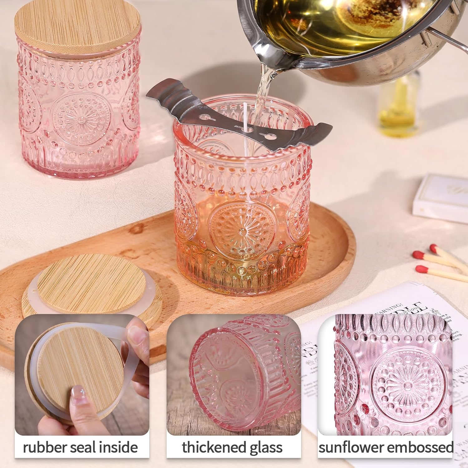 - Candle Making Supplies: You will get 10pcs pink candle containers, 10pcs bamboo lids and 10pcs candle warning labels. Each glass has a separate packaging protecting the glass from chips and cracks. However, due to transportation problems, some of the jars received were broken. Please contact us in time to solve the problem.
