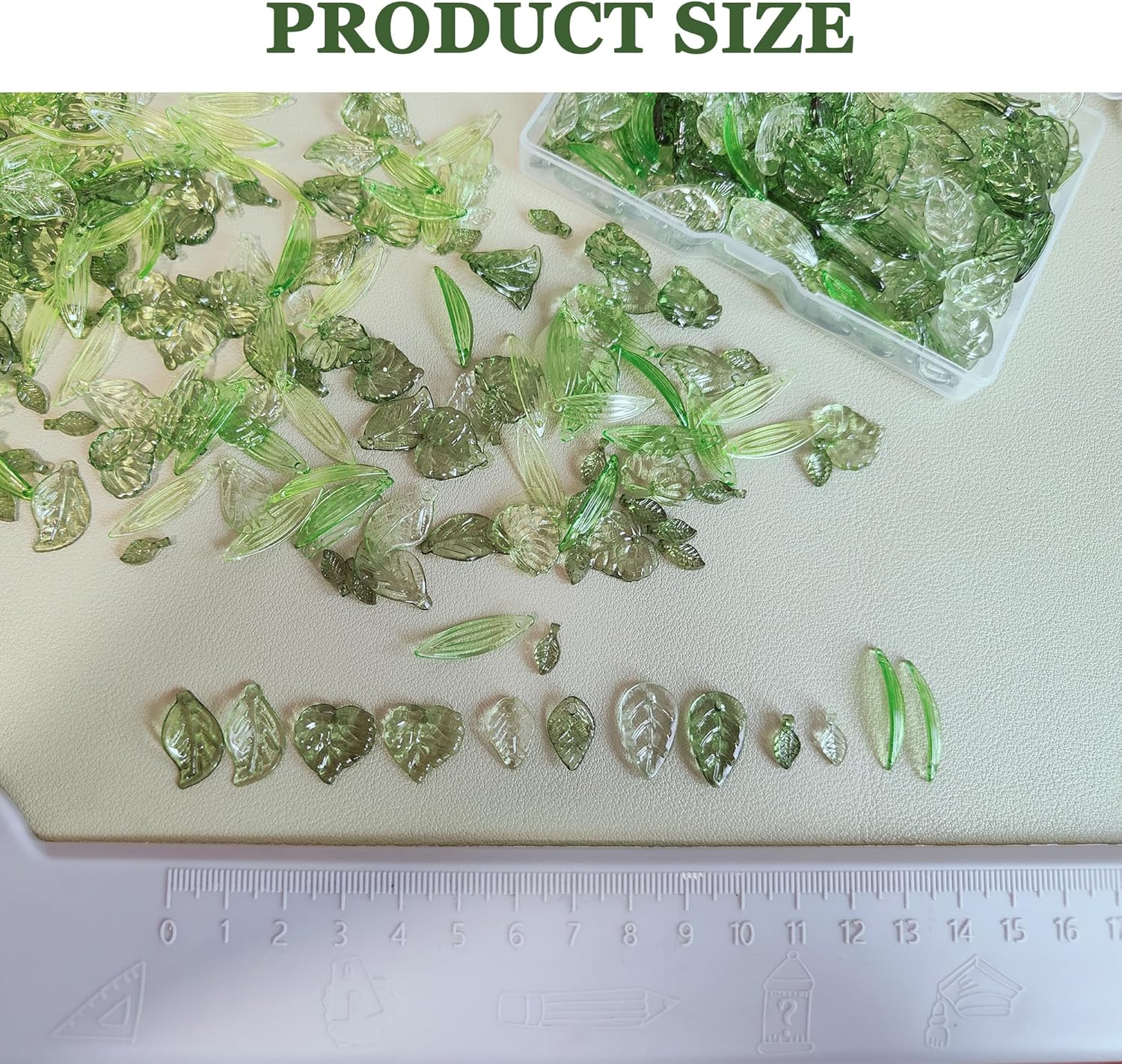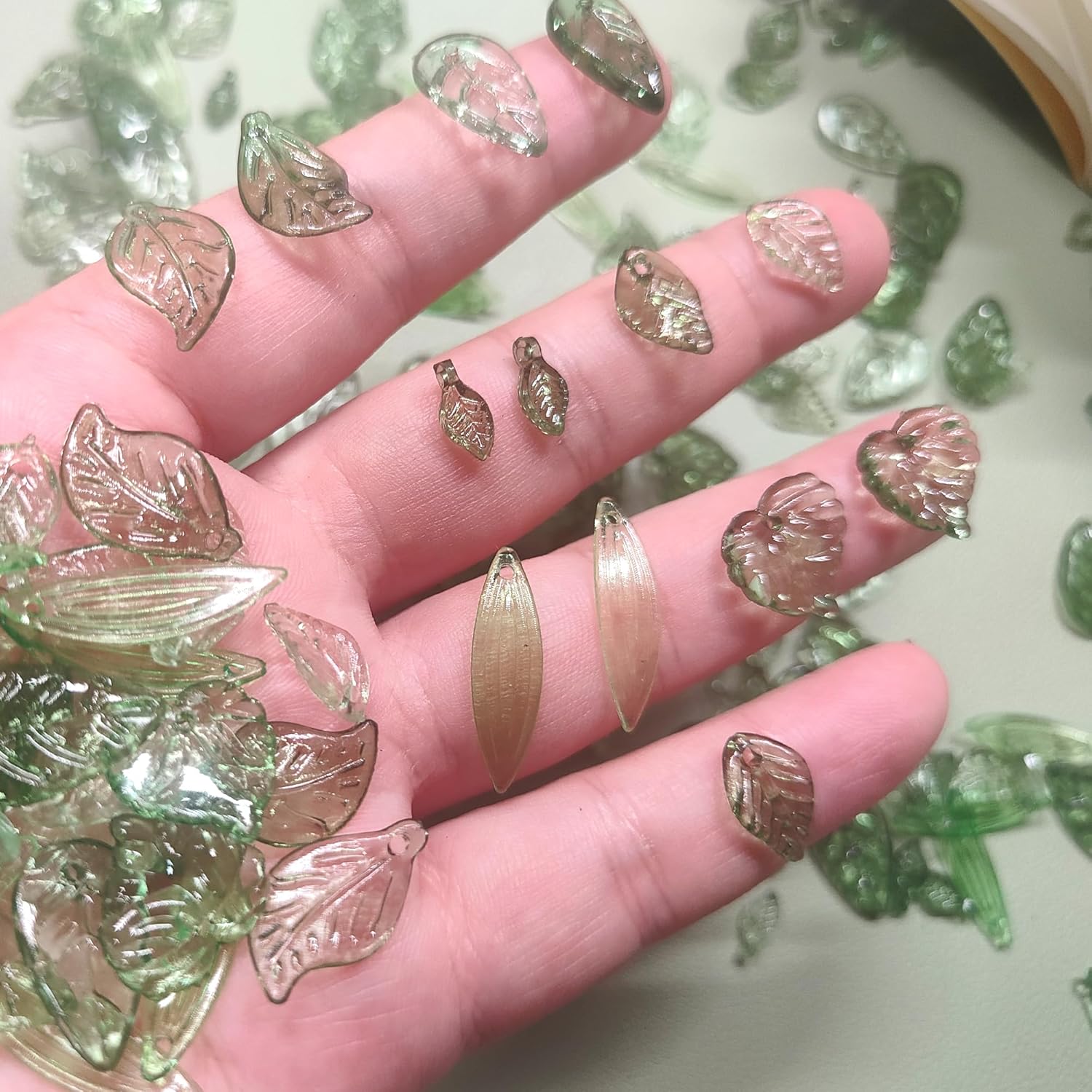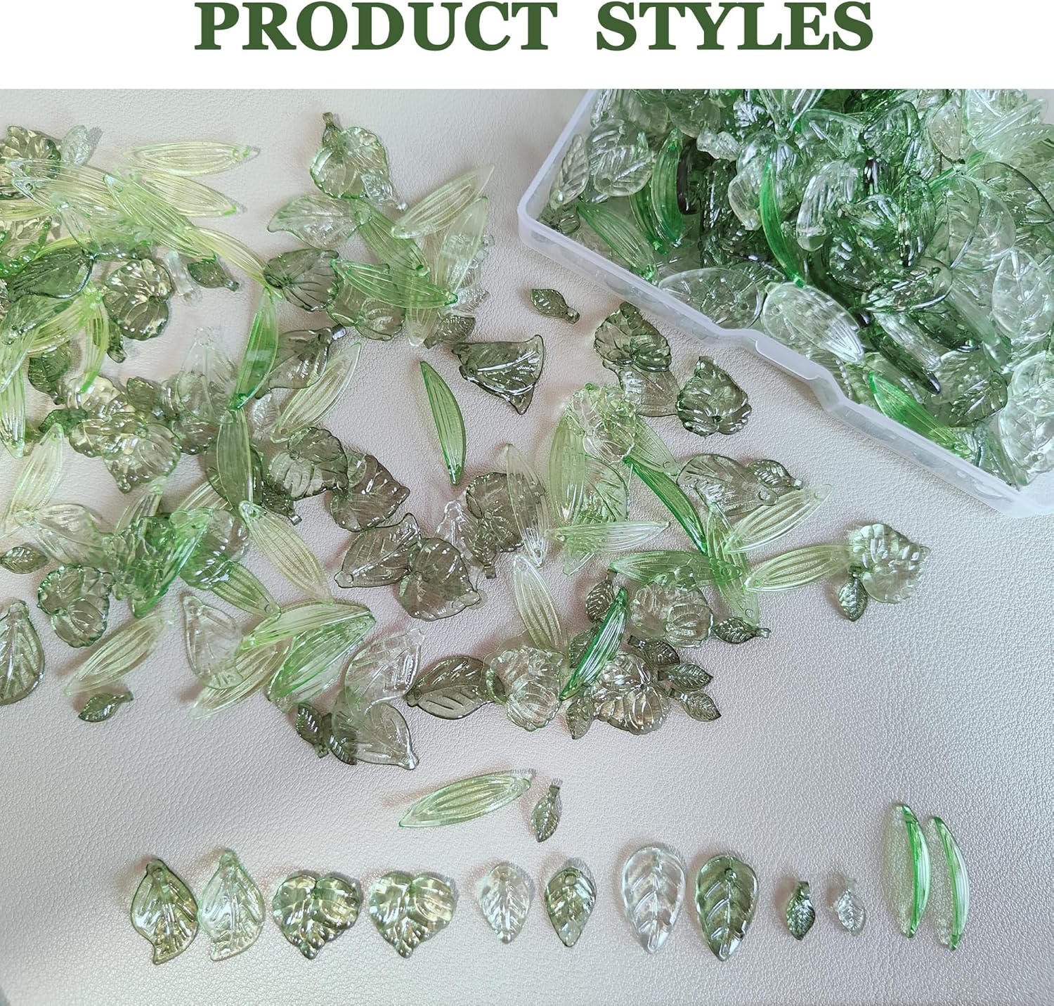 - đżăVariety of Green Leaf Beadsă: 10pcs x 6 styles Ă 2 color leaf charms, total 120pcs, packed in a plastic box for easy carrying and use.the charms are 10~38mm long, 5~22.5mm wide, hole: 1~2mm.This set includes a wide range of green leaf beads, glass leaf beads, and acrylic leavesâperfect for creating nature-inspired jewelry. These leaf-shaped beads bring a fresh, botanical vibe to any craft project.