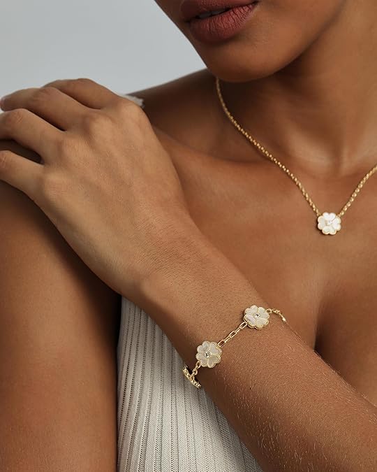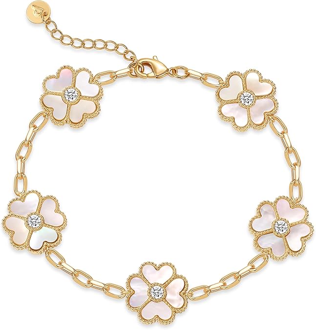 - PREMIUM QUALITY: Crafted with 14K yellow gold plating and featuring mother of pearl and cubic zirconia in a station flower design, this bracelet is like wearing elegance on your wrist. A designer bracelet dupe that gives you all the high-end vibes, making it the perfect statement piece to elevate your style. This bracelet for women is 100% hypoallergenic and safe for sensitive skin. It is nickel-safe, lead-safe, and cadmium-compliant, crafted to meet strict U.S. and EU standards for lasting comfort and everyday wear.