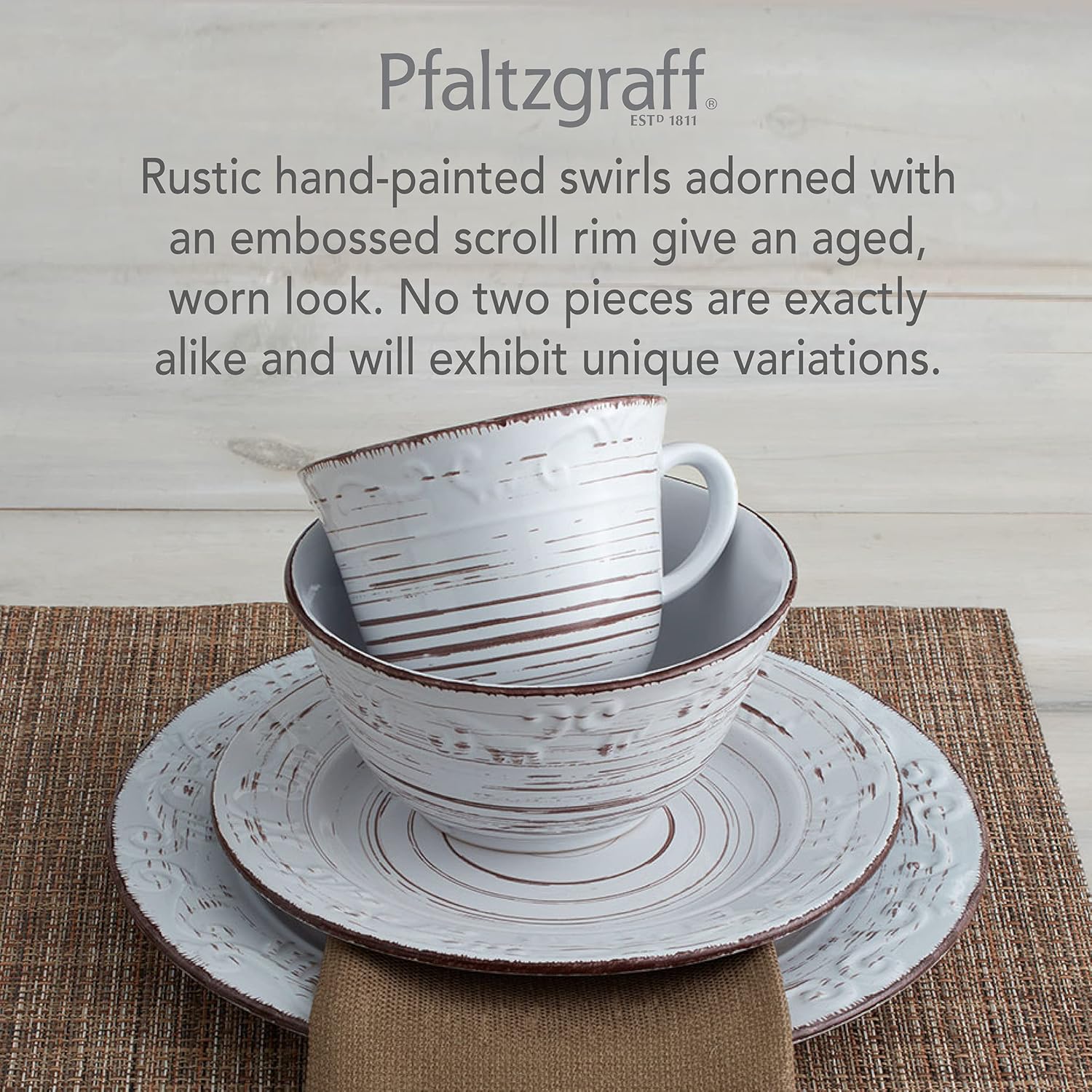- Beautiful details and design: Reminiscent of a metal trellis painted white then weathered by the elements over time, this unique dinnerware has a subtle scroll pattern and is accented by dark markings that give It an aged, worn look