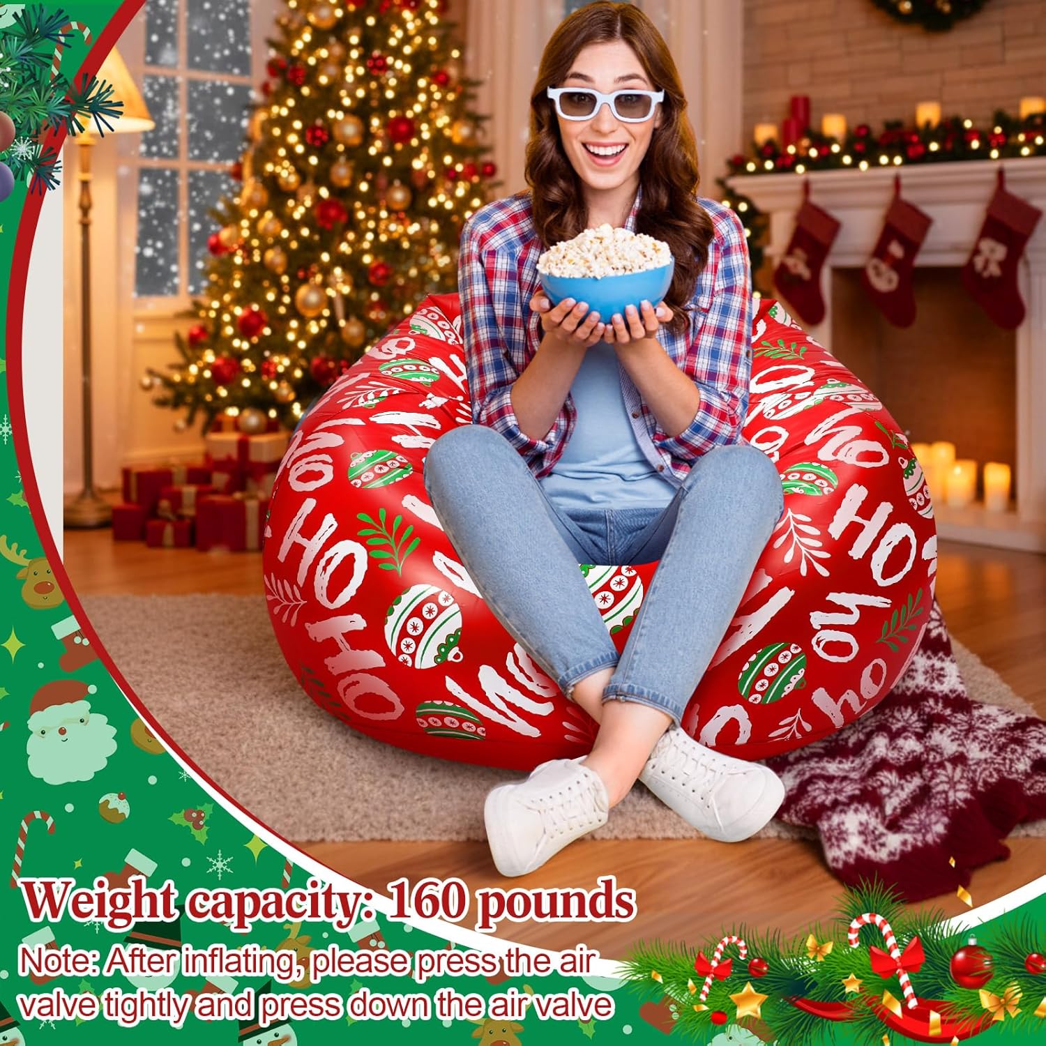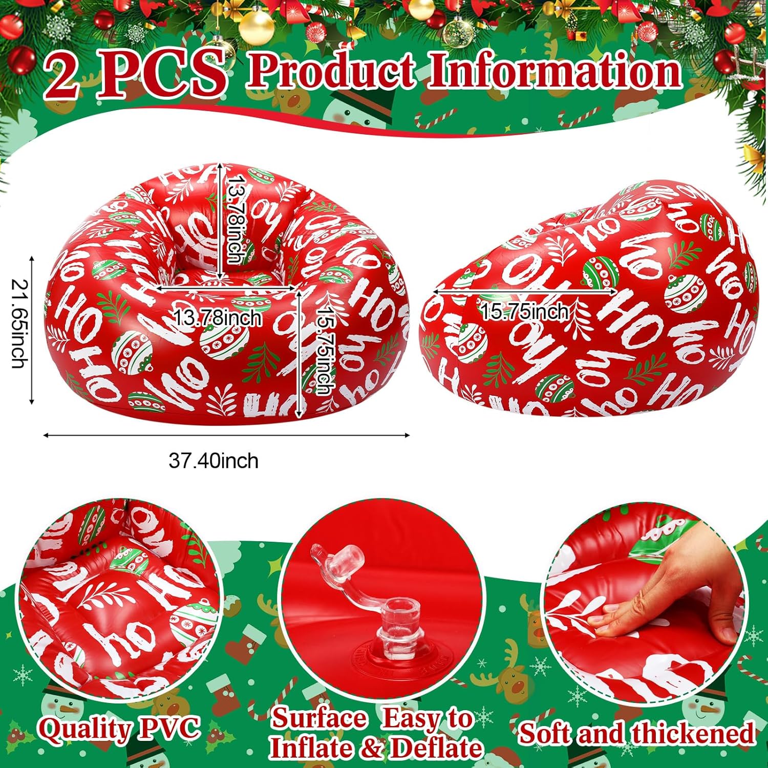 - PVC Christmas Inflatable Chairs: you will get 2 Christmas inflatable bean bag chairs decorated with exquisite green pine needles, Christmas decorative balls and patterns representing Christmas elements such as [HO], suitable for family and friends to read, watch movies, play games, etc. on Christmas, adding a romantic atmosphere to your space; The air pump is not included in the package