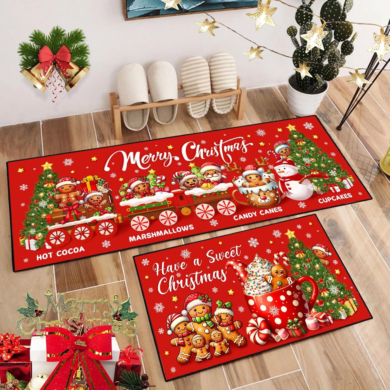2-Piece Merry Christmas Kitchen Rug Set with Gingerbread Man Design, Washable Non-Slip Floor Mats, 17×47″ + 17×30″