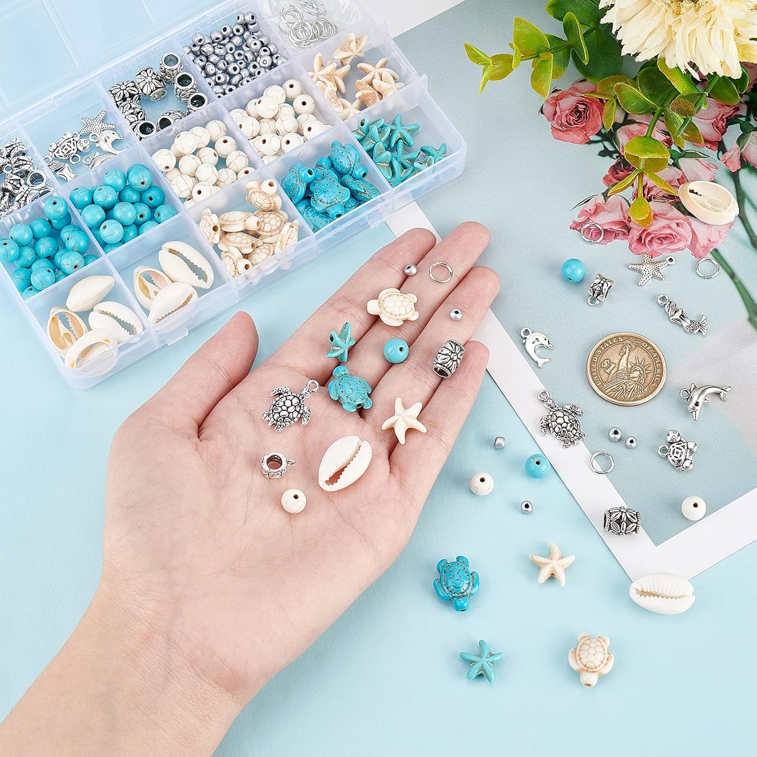 - Blue White Ocean Beads: There are various blue and white synthetic turquoise beads, including starfish, turtle and round beads with nature colors and patterns. And also include natural cowrie shell beads, with no hole, stringing by connecting at both ends to create jewelries.