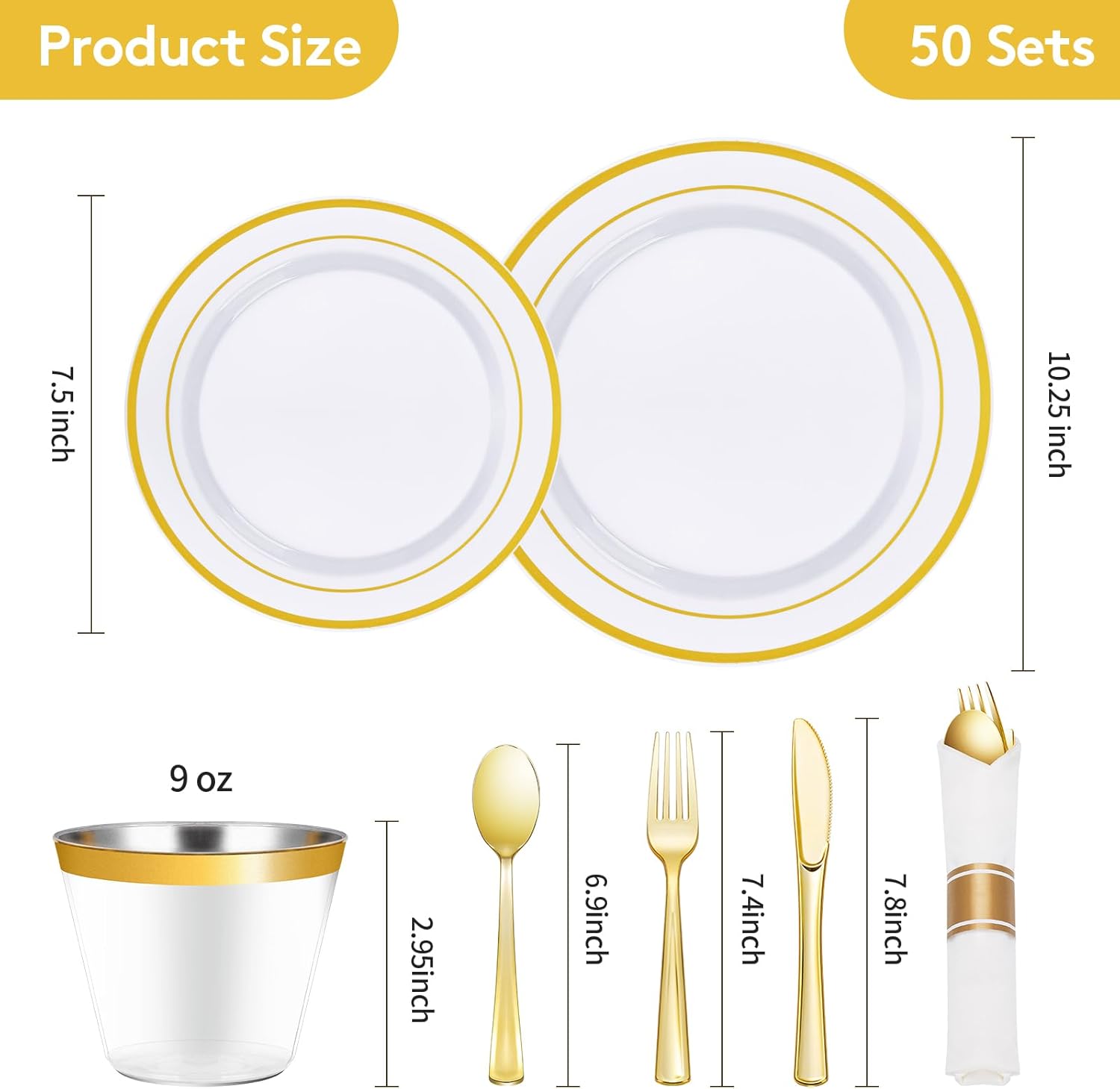 - IDEAL FOR PARTIES – With plastic plates for party, you can easily host a party without worrying about the cleanup at the end. You can throw them in the trash after use. These gold and white plastic party plates are great for weddings, holidays, baby showers, business parties, Thanksgiving, Halloween, and Christmas dinners.