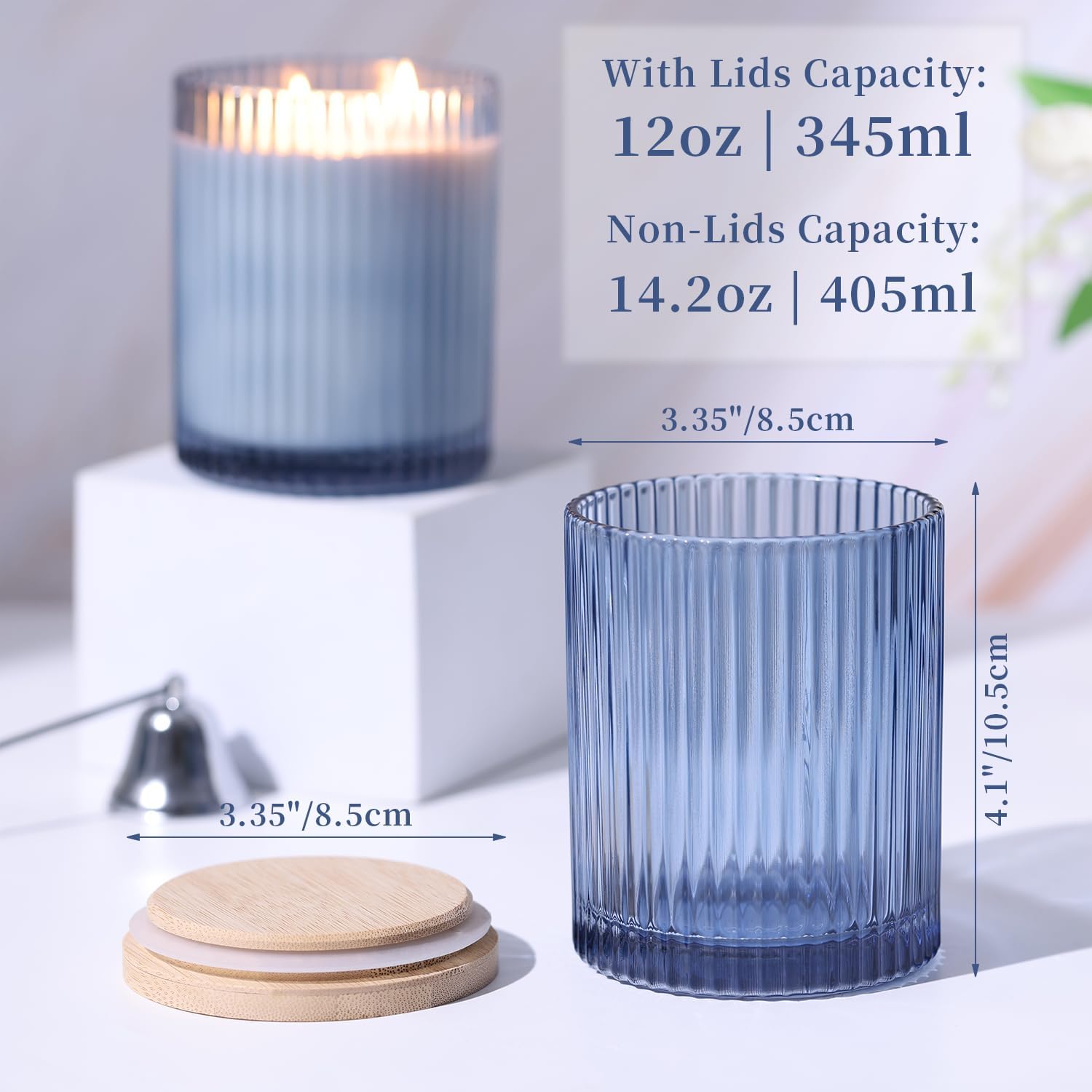 - Candle Container Details: Each candle jar measures 3.3″(W) x 4.1″(H). The container can hold 14 oz of candle without lid and 12.5 oz with lid. We offer 6 color options for you to choose from: Clear, Creamy, Blue, Green, and Pink. These colors are perfect for matching various settings and fragrances to suit your needs.