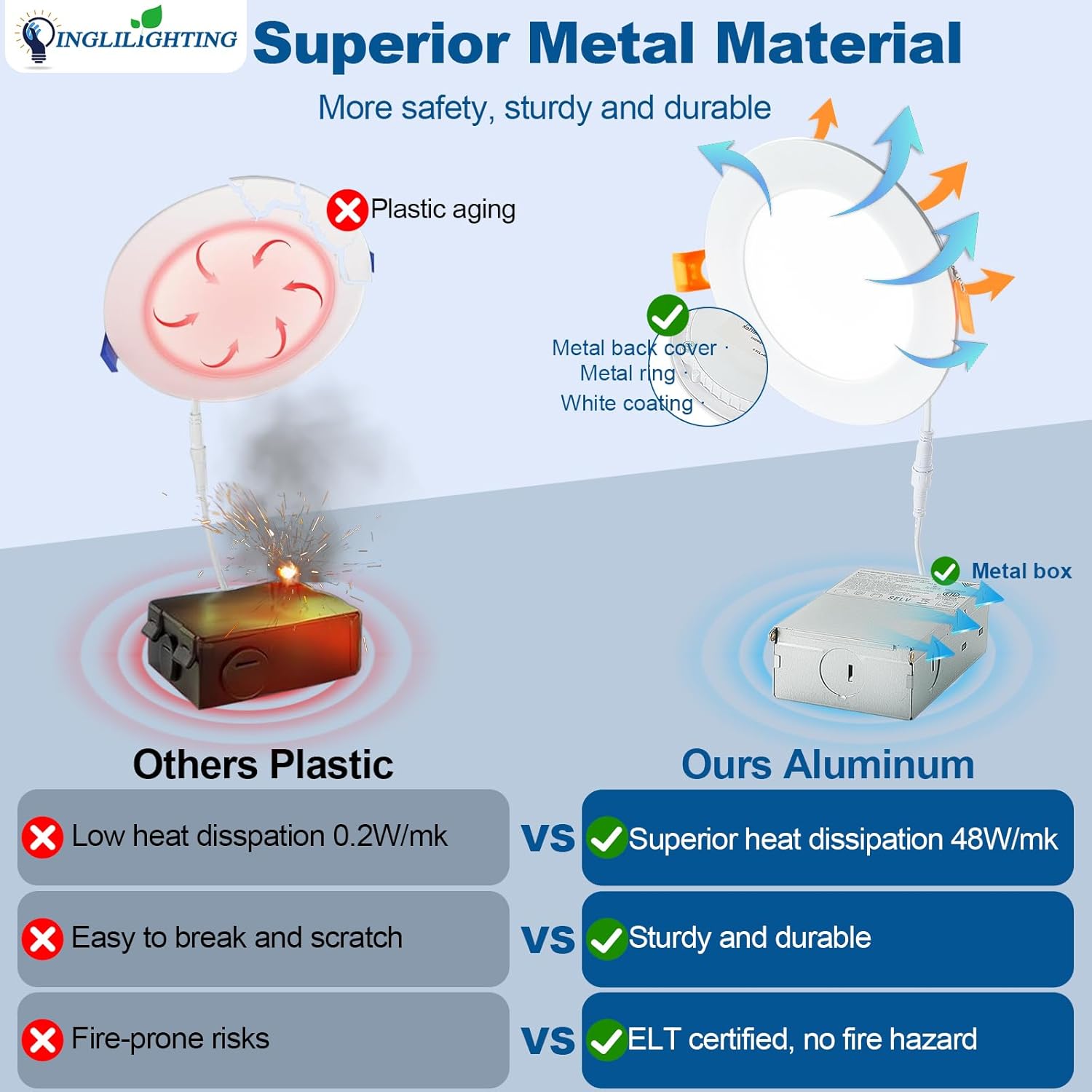 - Safe and Reliable LED Recessed Lighting: The recessed lighting 6 inch is IC rated for contact with insulation materials in the ceiling, with thermal protection and no fire hazard. The led can lights are also damp rated and can be installed above the shower room. And it also have also passed ELT and FCC certifications, ensuring strict safety and reliability for your home.