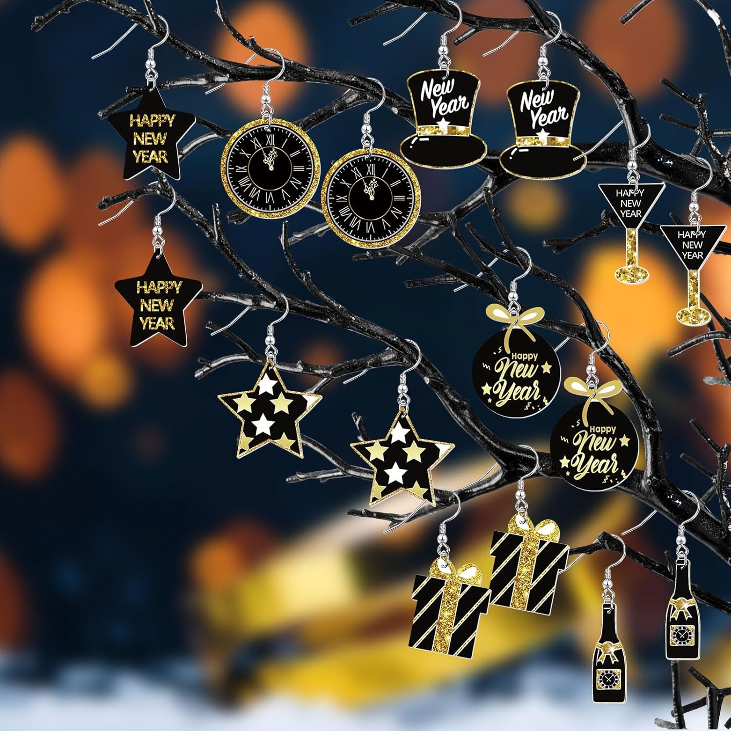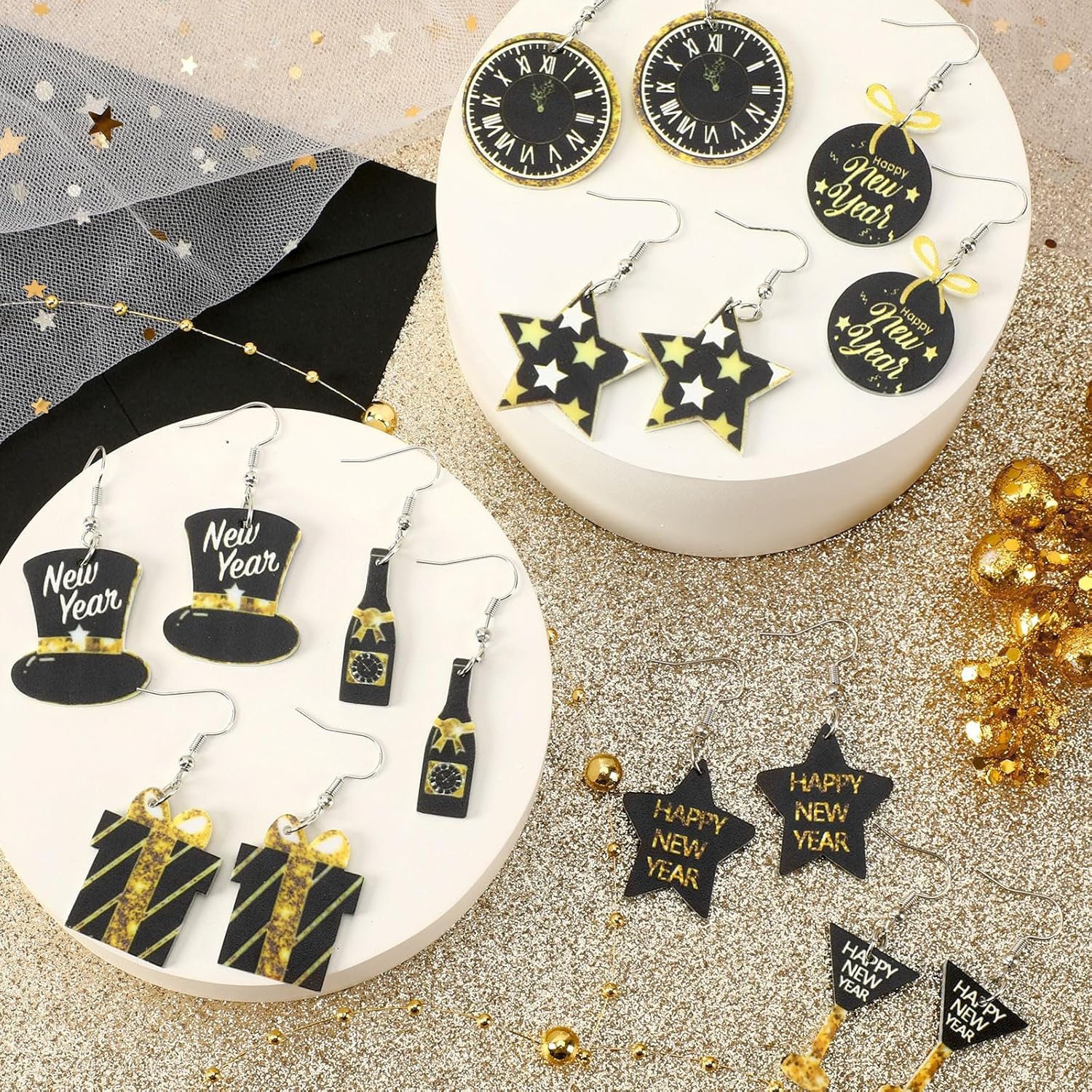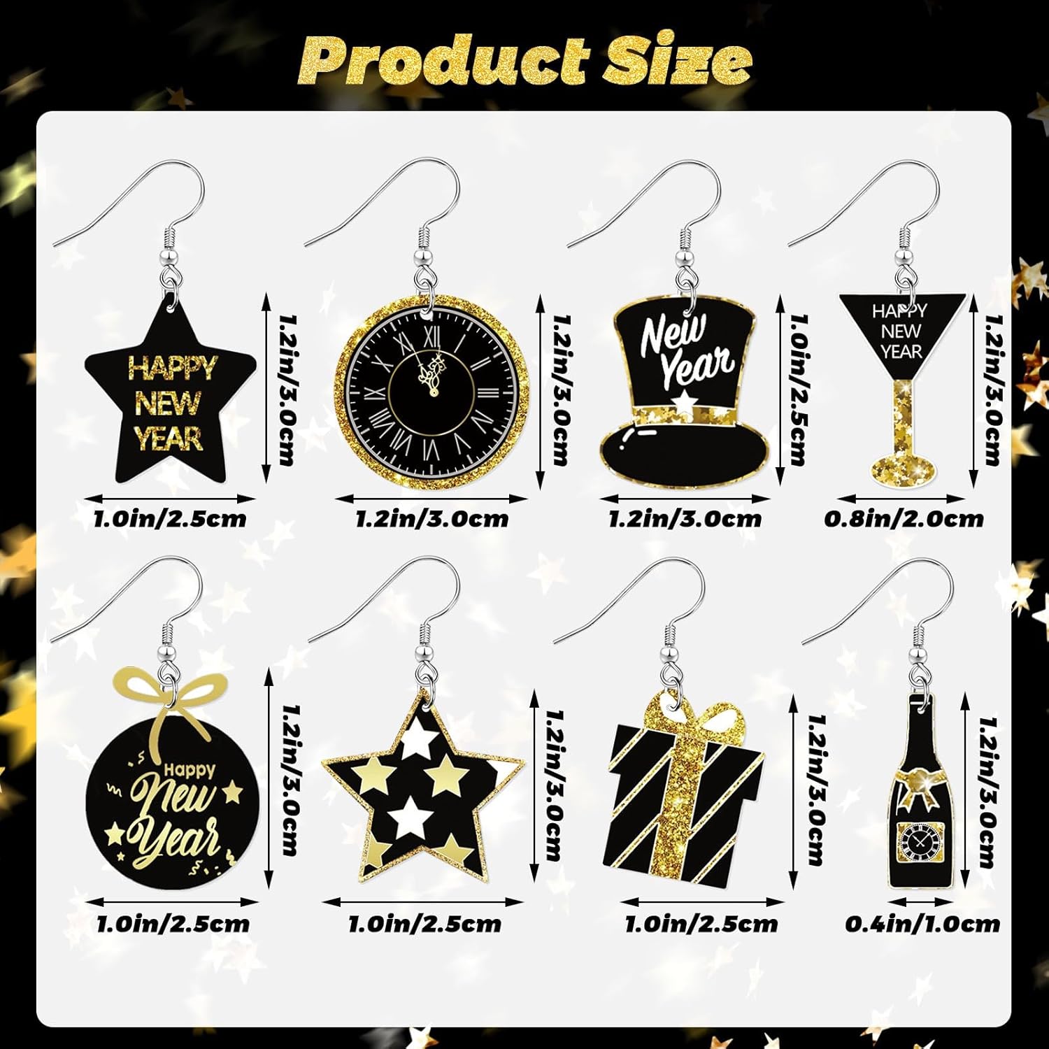 - New Year’s Elements: 8 kinds of happy New Year earring for women are designed with stars, champagne bottles, wine glasses, Top hat, clocks, gift boxes and other classic New Year’s elements. The acrylic star dangle earrings are cute and interesting, and can be matched with most new year’s clothes to help you create a special New Year’s look and help you stand out from the crowd