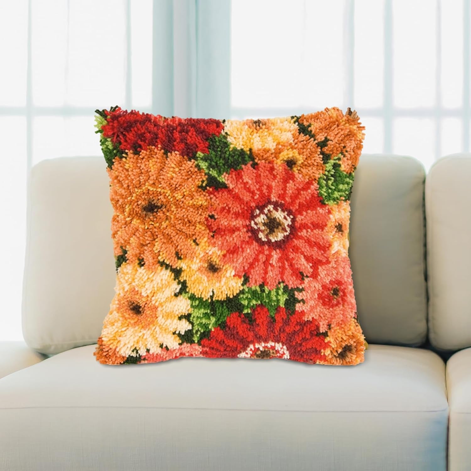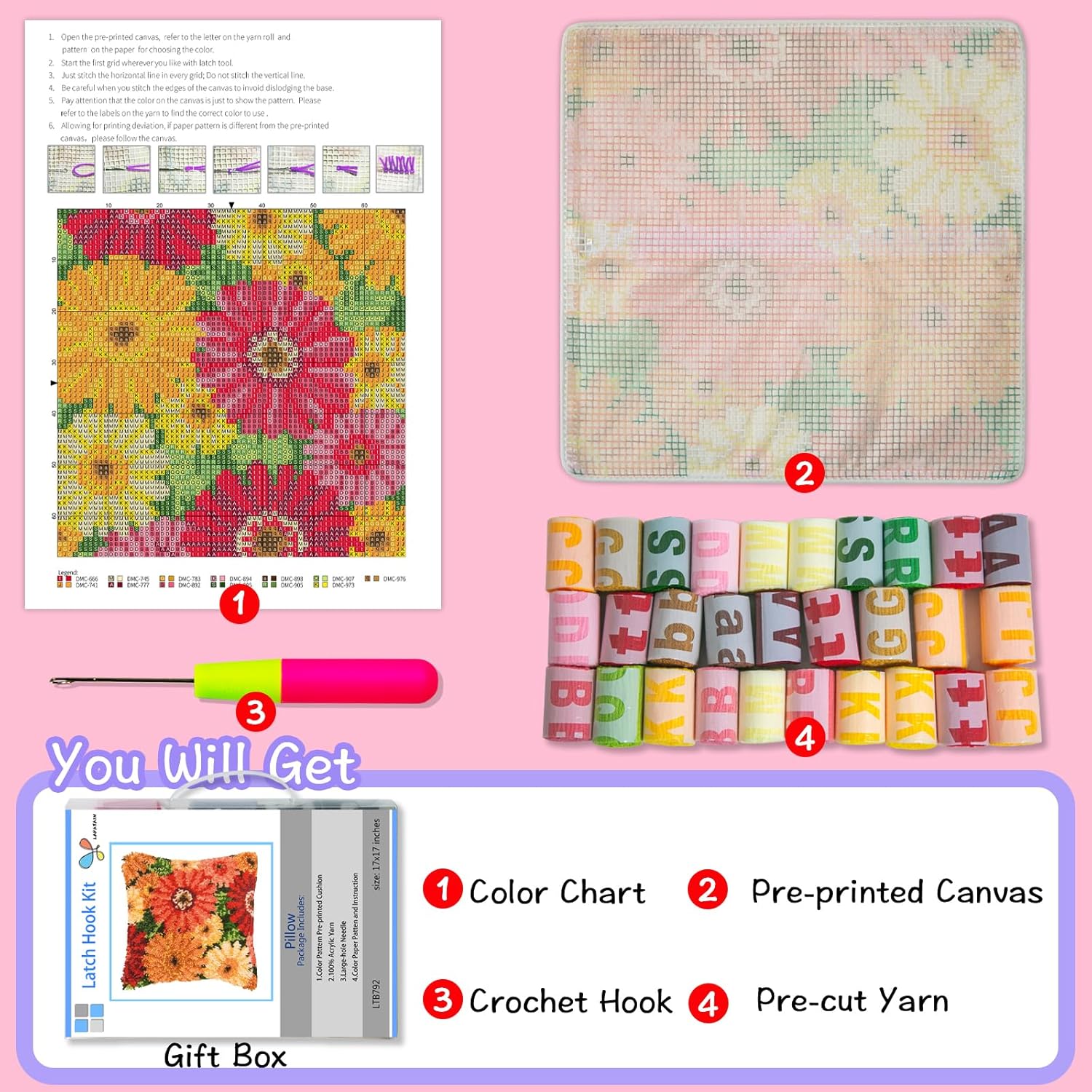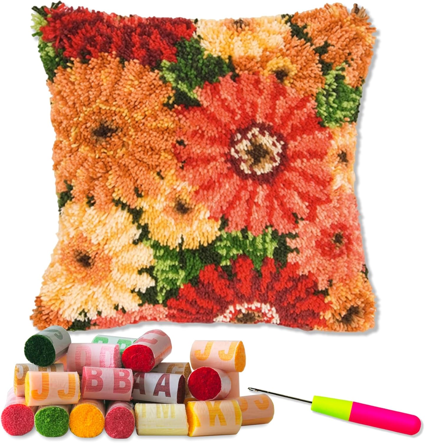 Latch Hook Pillow Kit, 17×17″ DIY Cushion with Colorful Flower Design