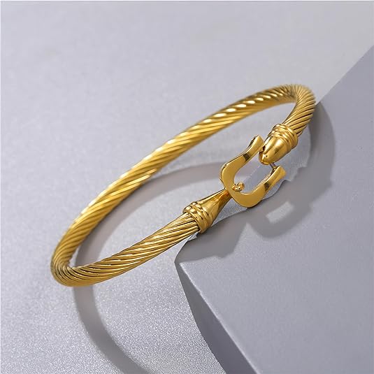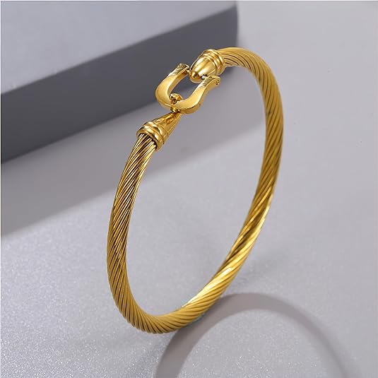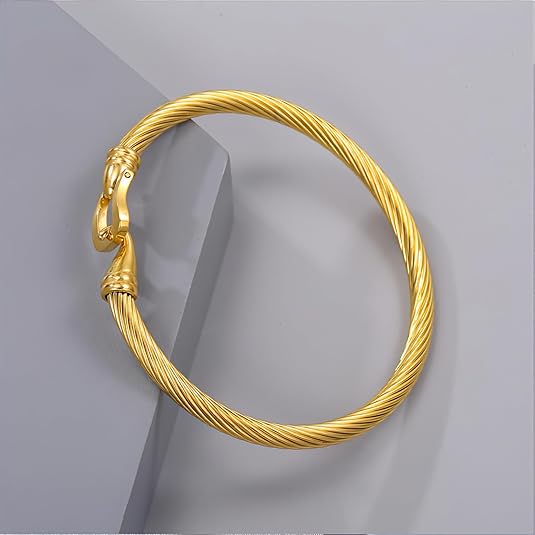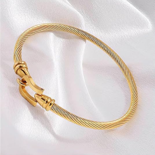 Elegant twisted cable design in silver and gold stainless steel for a stylish, modern look