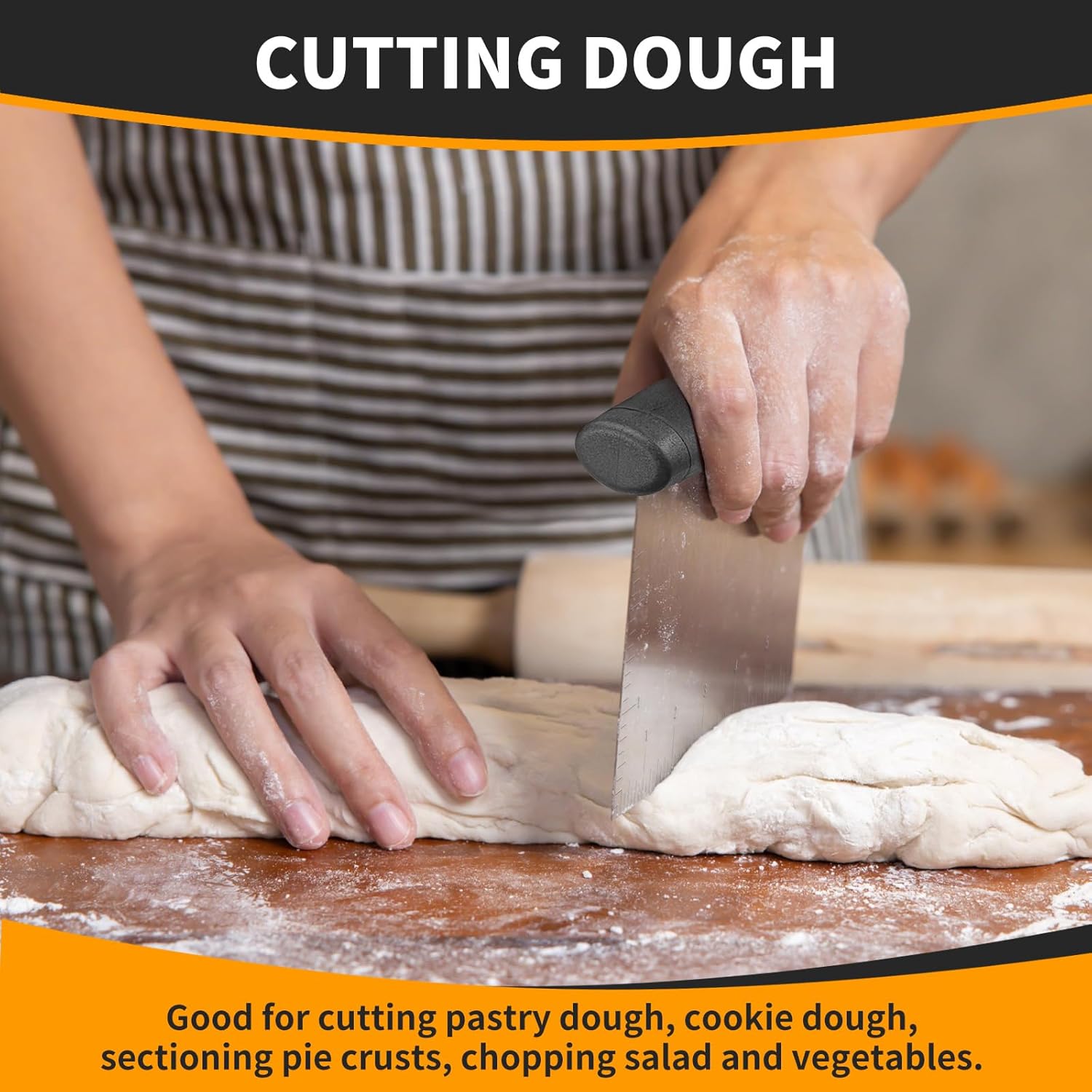 - Multi-purpose Dough Cutter: The bench scraper is a perfect gadget for household. The versatile kitchen utensils are not only designed to scrape dough effortlessly but can also be used as a kitchen scraper, baking scraper, dough knife, cake scrapper. Or used as a smoother for cake decorating or batter spreader. It’s perfect to your kitchen essentials.